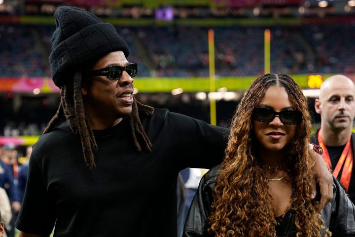 2025年2月のスーパーボウルに現れたジェイ・Zと娘のブルー・アイビーの親子。ブルーは堂々とした様子で、まるでママのビヨンセ?と見紛うほど。