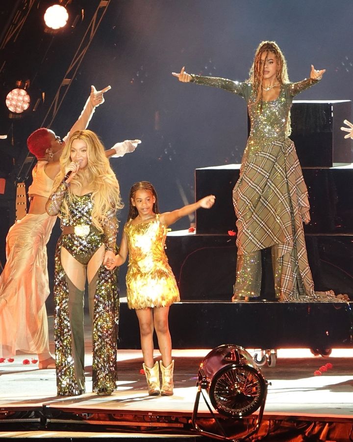 2023年、お揃いの衣装でステージ共演したビヨンセ&ブルー・アイビー親子。全面にストーン刺しゅうを施した長袖フットボールシャツは「IVY PARK × Addidas」。