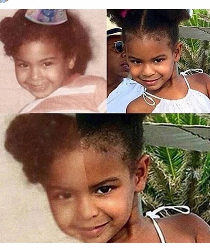 幼い頃のビヨンセとブルー・アイビーの顔をデジタルで半分ずつ合成してみると……ポーズを取る角度も、いたずらっぽい笑顔も完全一致! ビヨンセの母ティナ・ノウルズが自身のインスタグラムでシェアした。