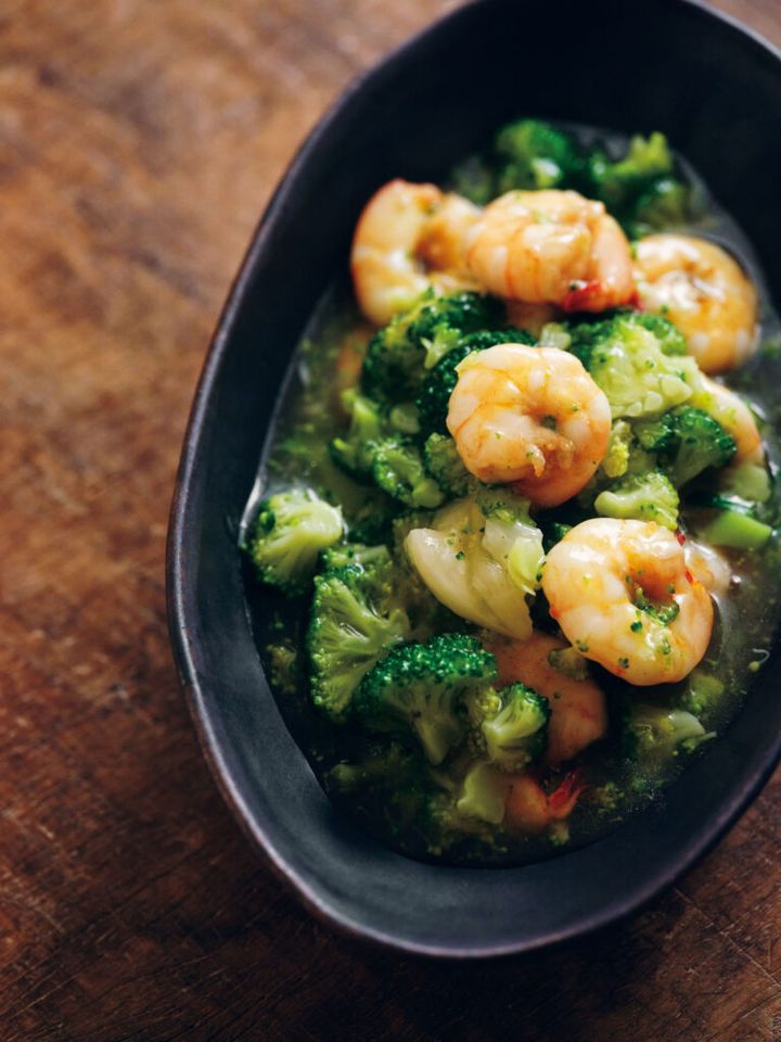ブロッコリーは横向きに置き、房をざくざくと粗く刻む。しんは厚めに皮をむき、同様に粗く刻む。にんにくは包丁の腹でつぶす。むきえびはあれば背わたを取って塩、こしょうをふり、片栗粉をまぶす。煮汁の材料は混ぜる。