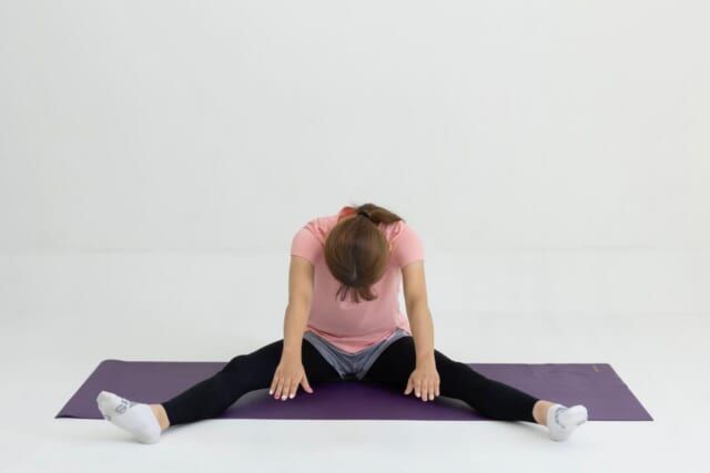 (2)上半身をゆっくりと前に倒し、倒しきったところでゆっくり呼吸しながら30秒間キープする