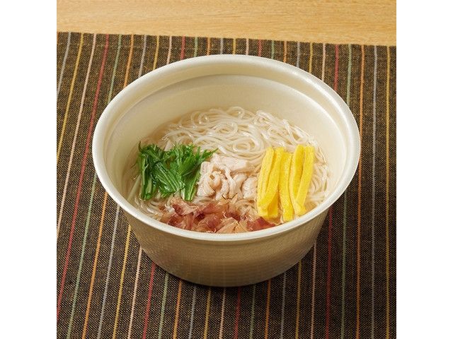 つるっとのどごしの良いそうめんに、鶏の旨みをベースにゆず皮の香りを加えた塩味のあっさりスープを合わせた温かいそうめんです。具材として蒸し鶏・水菜・錦糸たまご・花かつおをのせました