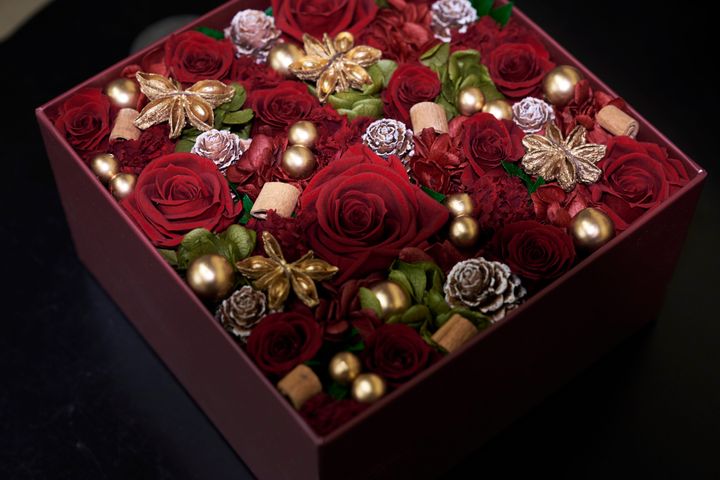 今回手掛けたのは、ホリデーシーズンに贈りたくなる“薔薇や秋の実物”などをメインにした、オレンジ~ボルドー系の花材でつくるオリジナルの「フラワーボックス」。ニコライ バーグマンが提供しているフラワースクールでも人気講師として慕われている桐榮祥子さんにアドバイスをいただきながら、それぞれの感性に従って「フラワーボックス」をつくっていきました。