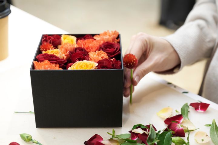 そもそも、このボックススタイルの誕生は、2000年にニコライ・バーグマンが「イベントの手土産としてお渡しするフラワーギフトを、積み重ねて保管・配布できる形で納品して欲しい」と依頼されたことがきっかけとなり、ボックスに詰めることを考案したといいます。その際は採用されなかったそうですが、試しに店頭に並べてみたところ、感度の高い人たちの口コミで広がり、瞬く間にアイコン商品になったそうです。そんなストーリーが聞けるのも、ワークショップならではの楽しみのひとつ。