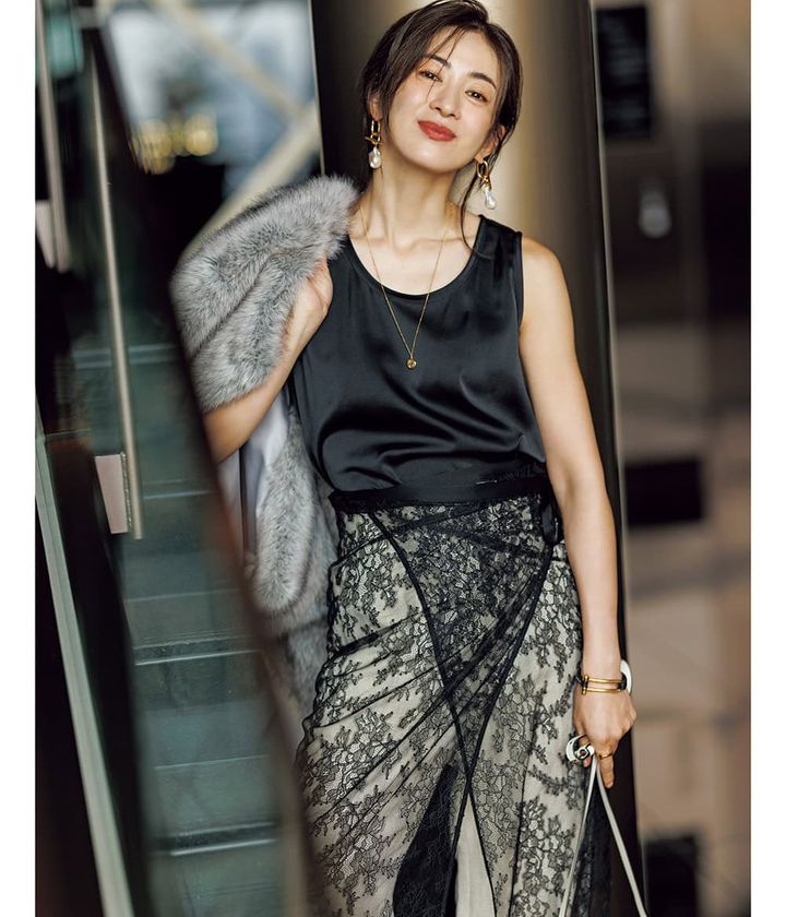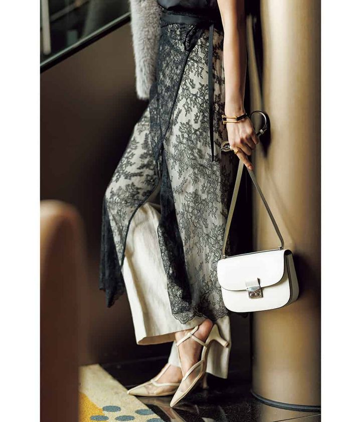 スカート¥35,200パンツ¥35,200(ともにカオス/カオス表参道)アウター¥50,600(ハブレス/ジャック・オブ・オール・トレーズ プレスルーム)トップス¥14,300(アルページュ ストーリー/アルページュストーリー プレスルーム)バッグ¥209,000(ボナベンチュラ)シューズ¥17,600(ダイアナ/ダイアナ 銀座本店)ピアス¥14,500(ダブルスタンダードクロージング/フィルム)ネックレス¥29,700(マリハ)ブレスレット¥28,600リング¥20,900(ともにシーエックスシー/アマン)