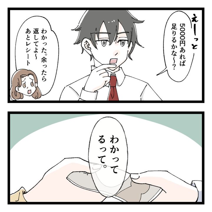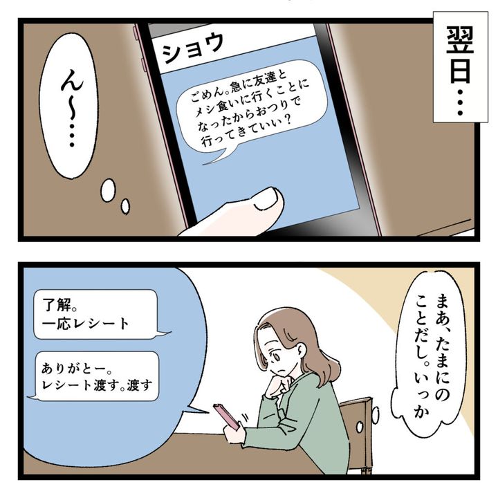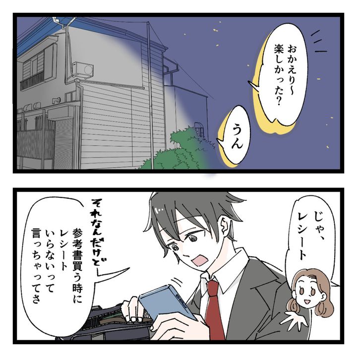 夜になって帰宅したショウは、楽しかったと満足そう。たまにはこんな日があってもいいかもね。さっそく「じゃ、レシート。」と催促すると、ショウは私とは目を合わせず「それなんだけど」と前置きして、参考書を買うときにレシートは要らないと言ってしまったと言いました。
