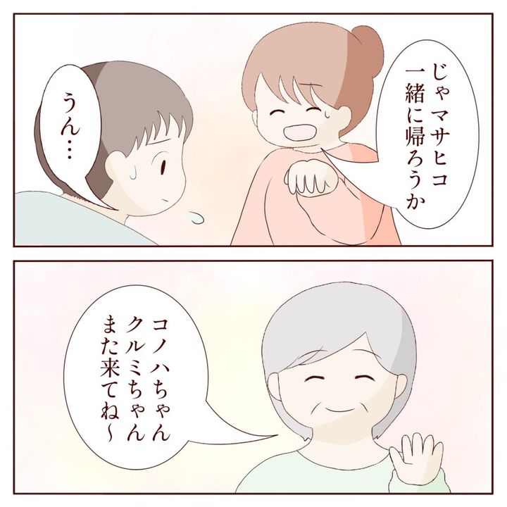 「じゃ、マサヒコ一緒に帰ろうか」とチエミさんに声をかけてもらったマサヒコさんは「うん・・」と力なく立ち上がりました。「コノハちゃん、クルミちゃん、また来てね~」義母はマサヒコさん達家族を笑顔で送り出しました。