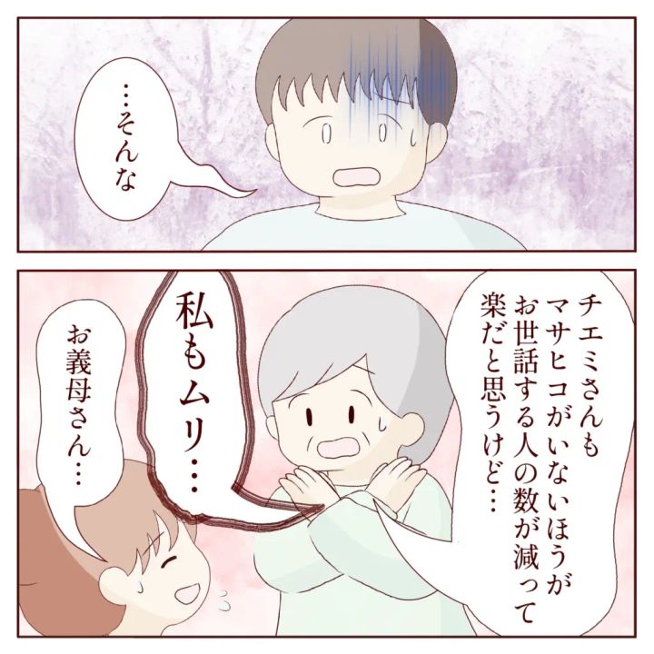 義母の本心を聞いたマサヒコさんは「・・そんな」と顔面蒼白。「チエミさんもマサヒコがいないほうがお世話する人の数が減って楽だと思うけど・・私もムリ」とチエミさんに同情しながらもきっぱり断る義母に「お義母さん・・」とチエミさんも苦笑い。