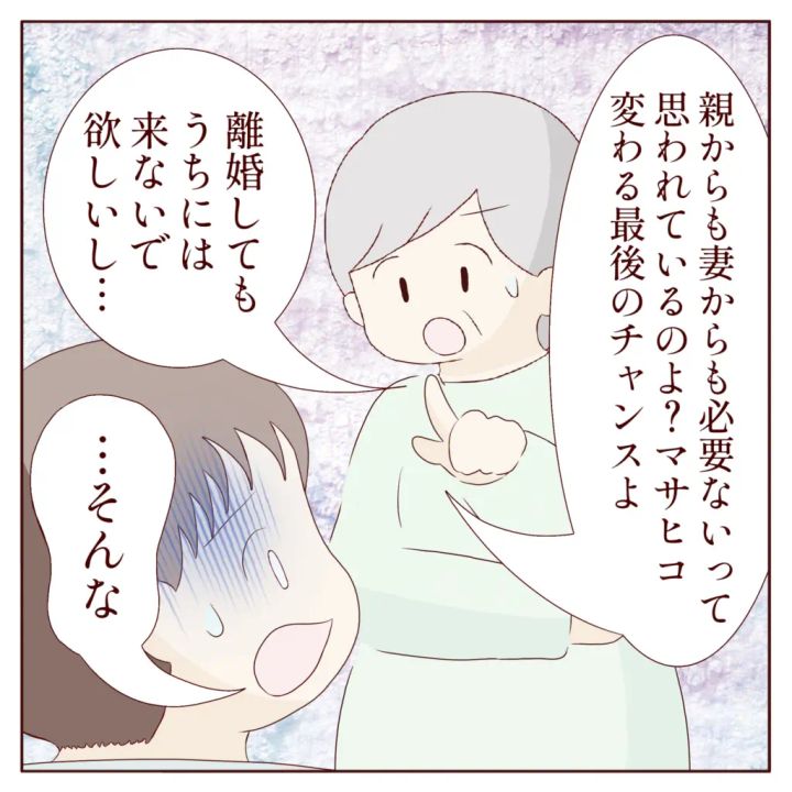 「親からも妻からも必要ないって思われているのよ?マサヒコ、変わる最後のチャンスよ。離婚してもうちには来ないで欲しいし・・」と母親からきっぱり拒否され「・・そんな」とショックを受けるマサヒコさん。