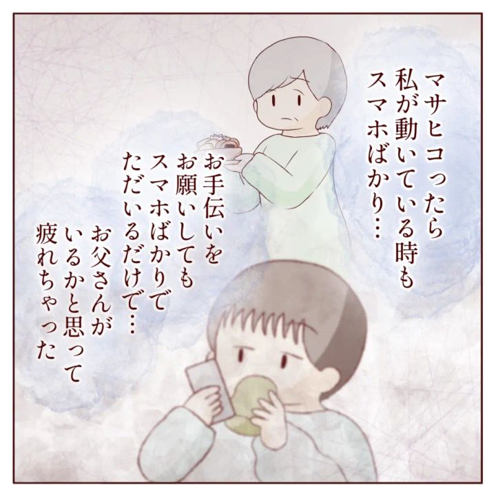 「マサヒコったら、私が動いている時もスマホばかり・・。お手伝いをお願いしてもスマホばかりでただ居るだけで・・。お父さんが居るかと思って疲れちゃった」義母はマサヒコさんが実家にいた間のことを呆れた様子で話しました。