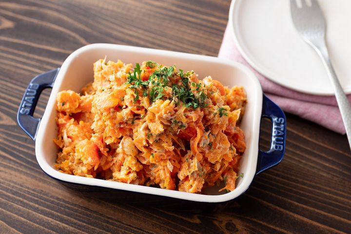 にんじんを電子レンジで丸ごと加熱してフォークで潰すだけ! ツナとごまのコク、粉チーズのまろやかさが合わさって、子どもから大人まで食べやすいお手軽万能サラダです。