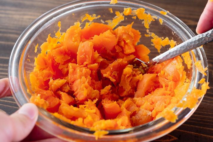 2. 1のヘタを取り、フォークで潰す。