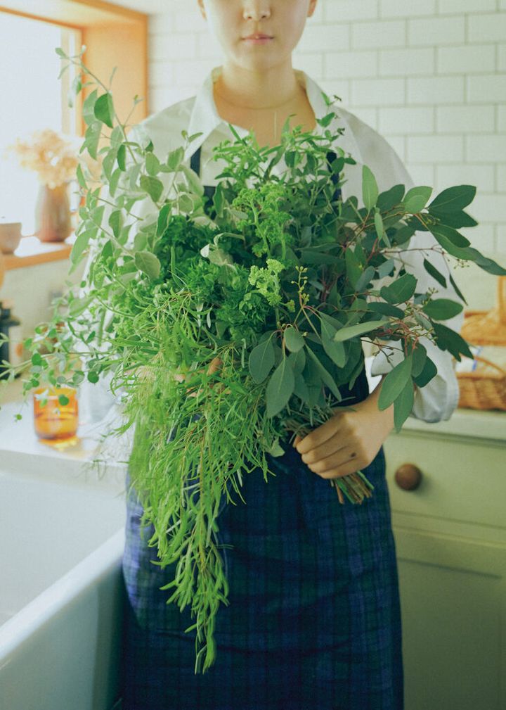 『ル・ベスべ』の松岡龍守さんが選んでくれた今月の花は、3種のユーカリ。向かって右の大きな葉はポポラス ベリー、左下へ流れる細葉のニコリー、左奥に覗く丸い葉のグニー。中央のバラ オリエンタルエクレール、ゼラニウム、左上に伸びるグミの葉と合わせて、グリーンの葉と花のみのブーケに。「さっぱりとした香りで、キッチンに飾りやすいユーカリ。近年は鉢植えや庭木でもよく見かけますし、国内で様々な品種に出合えるようになりました。グリーンだけを生けるのは難しく感じるかもしれませんが、グラデーションを意識するときれいにまとまりますよ」(ル・ベスべ 03−5469−5438) エプロン¥7,590(フォグリネンワーク 03−5432−5610) シャツ¥46,200(マーガレット・ハウエル 03−5785−6445) その他スタイリスト私物