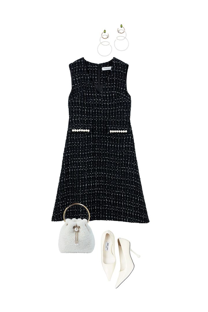 コンサバな印象の強いブラックのツイードワンピースも、シャープなVネックとAラインのようなシルエット、ポケットを彩るパールの装飾で着映え効果抜群。流線形のピアスとパール付きのシアリングバッグ、プレーンな白のパンプスでエレガンスあふれるドレスアップを完成させて。