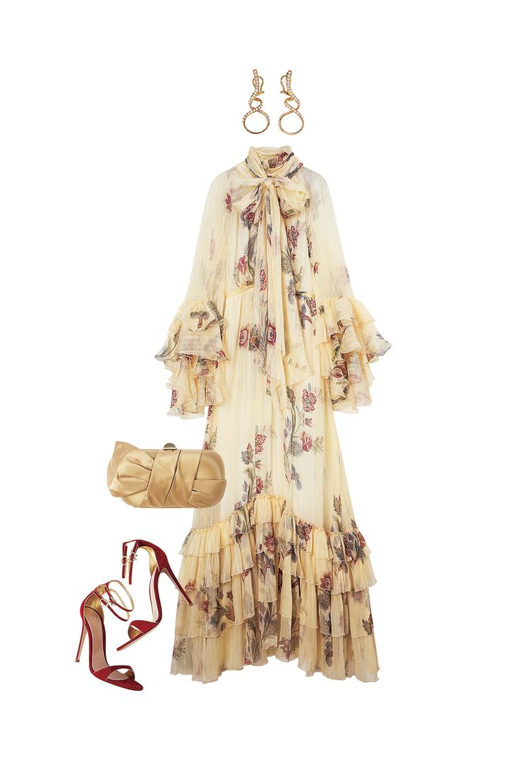 ドレス¥1,287,000(エトロ/エトロ ジャパン) バッグ¥123,200(ロド/メゾン・ディセット) 靴¥218,900(ジャンヴィト ロッシ/ジャンヴィト ロッシ ジャパン) ピアス¥2,035,000(スカヴィア/スカヴィア本店 帝国ホテル東京本館1階)