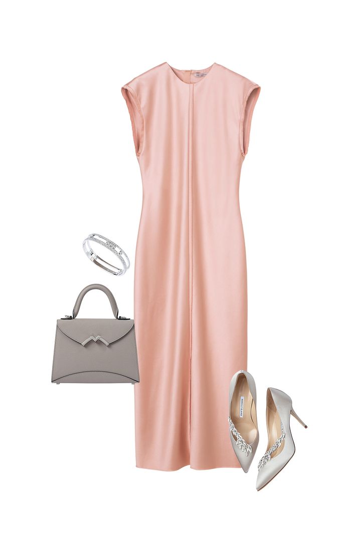 ワンピース¥192,500(アミ パリス/アミ パリス ジャパン) バッグ¥596,200(モワナ/モワナ 伊勢丹新宿店) 靴¥217,800(マノロ ブラニク/ブルーベル・ジャパン) ブレスレット¥5,324,000(メシカ/メシカ ジャパン)