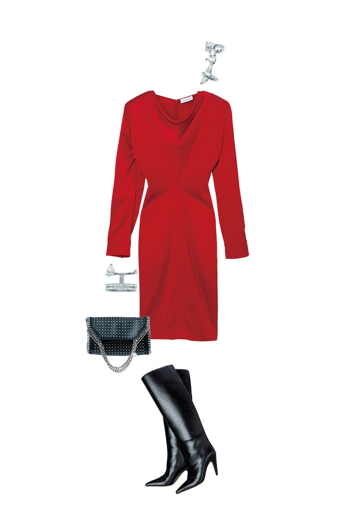 鮮烈な赤ドレスに辛口の黒小物を投入