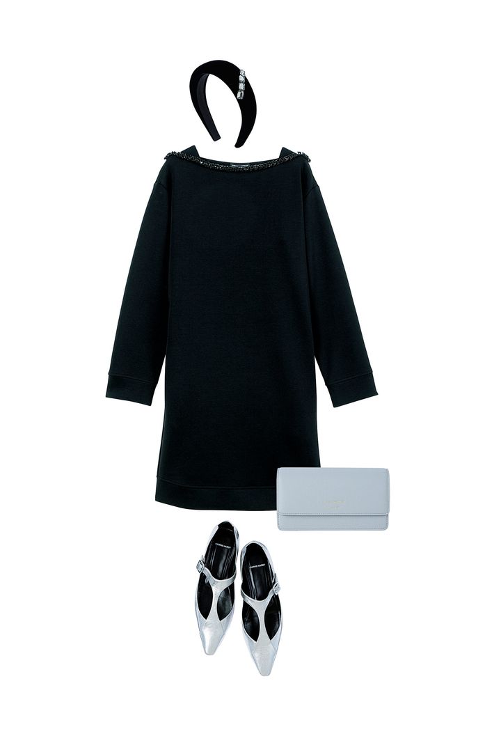 心地よいダブルジャージーで仕立てられたブラックドレスは、ネックラインで煌めく黒のラインストーンがアクセントに。小物はシックなグレー&シルバーを選び、洗練ムードをプラスして。
