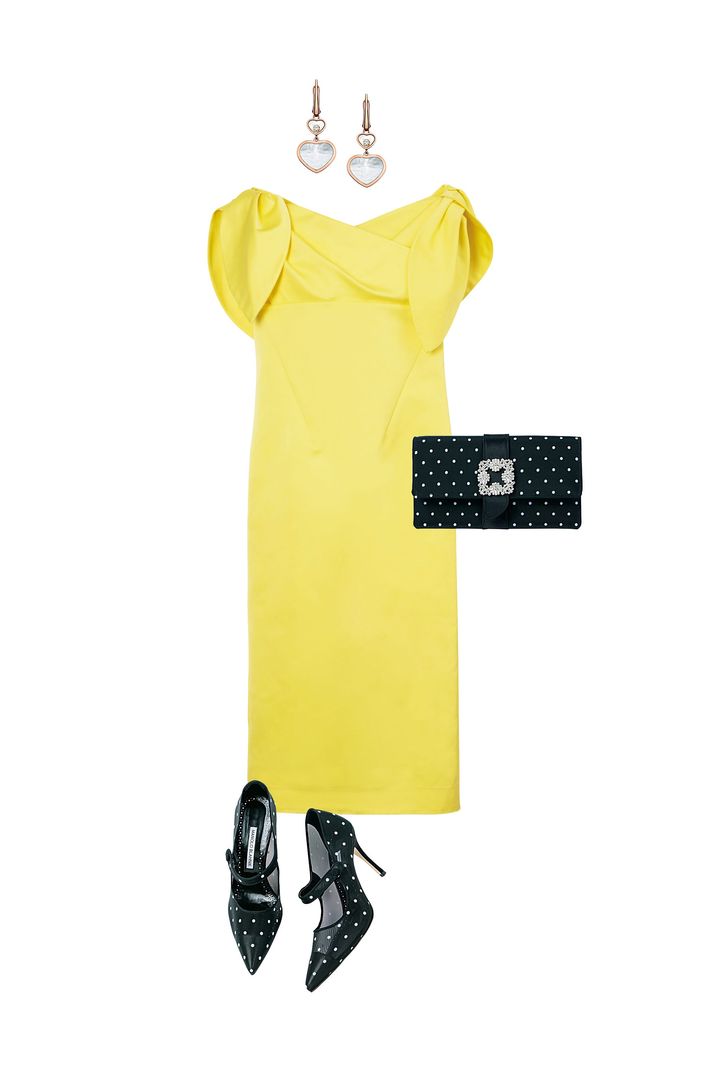 フレッシュな存在感を放つ黄色のオフショルダードレスは、肩の立体的なリボン装飾や上品な光沢、リーンなシルエットがモード派向き。バッグとパンプスはレトロ&シックな黒のドット柄で統一。