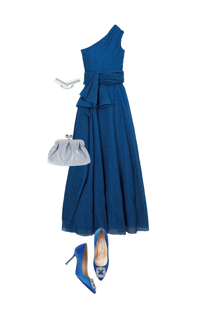 品のよさと清潔感を携えたコバルトブルーのワンショルダードレスは、立体的なリボンベルトがアクセントに。ビジューやスパンコールの小物が、パーティにふさわしい華やぎを演出。