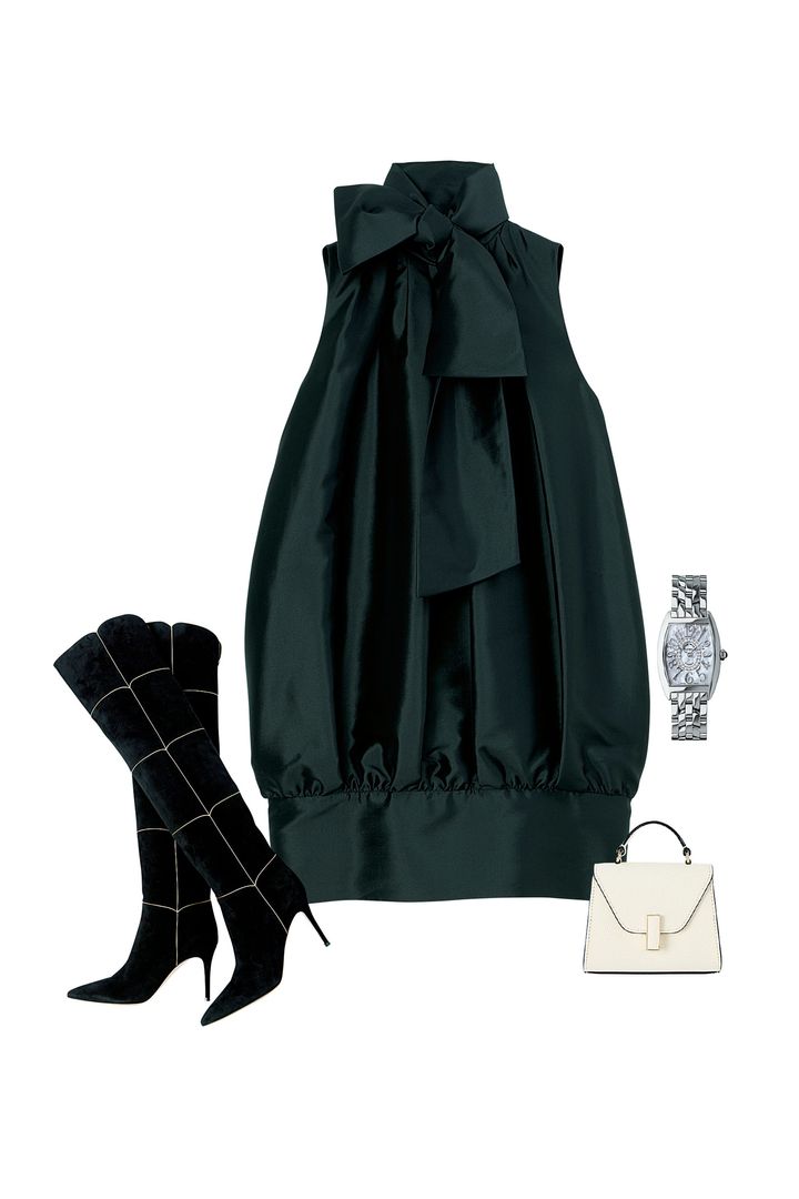 取り外し可能なボウとバルーンシルエットが愛らしい一着。今年顔のスエードのニーハイブーツがミニドレスと好相性。