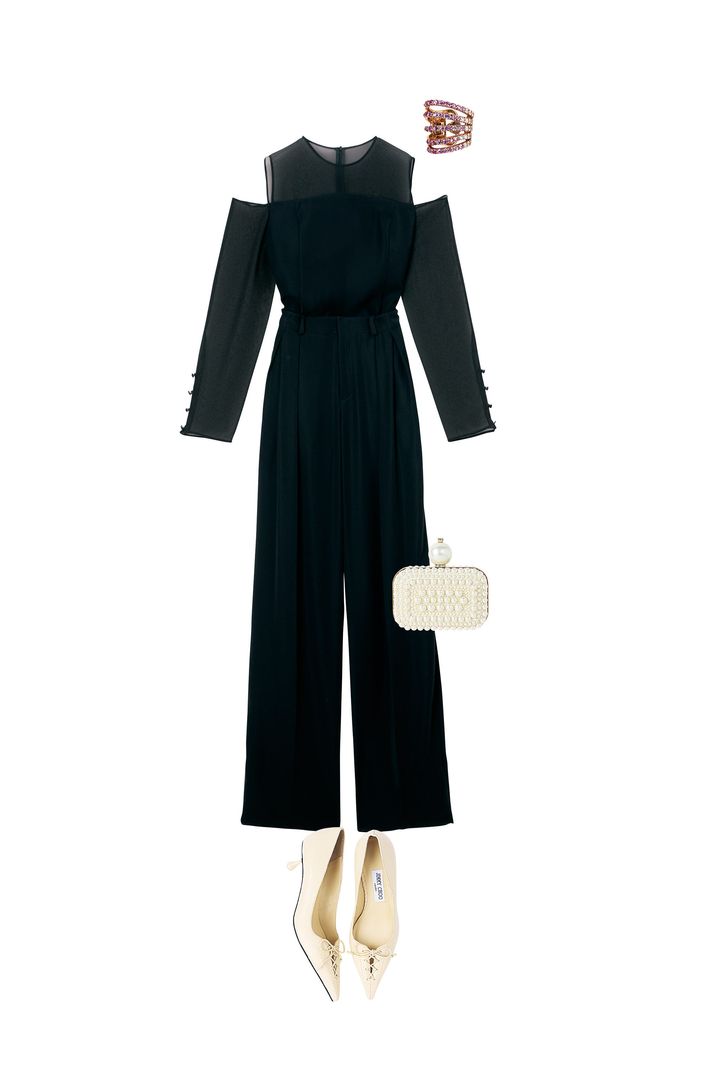 オープンショルダーかつデコルテと袖がほんのり透けるブラウスが軽やかさを演出するブラックコーデ。パールを敷き詰めた小ぶりなクラッチとリボン付きのレザーパンプスで品格をプラスして。