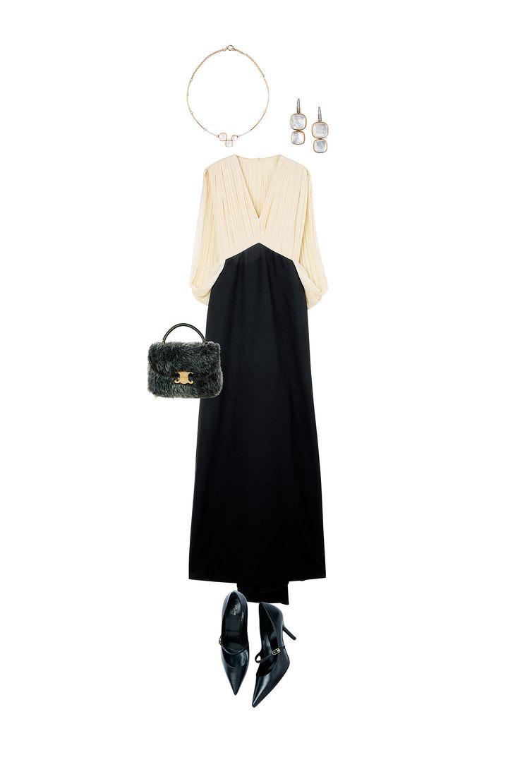 ドレス¥1,034,000 バッグ¥544,500 靴¥170,500[すべて参考価格](すべてセリーヌ/セリーヌ ジャパン) イヤリング¥1,111,000 ネックレス¥2,618,000(2点共ポメラート/ポメラート クライアントサービス)