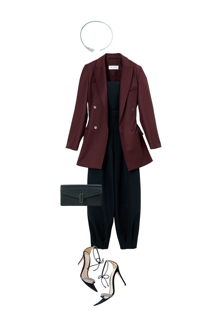 ジャケット¥253,000 オールインワン¥282,700(2点共マックスマーラ/マックスマーラ ジャパン) バッグ¥300,300(ヴァレクストラ/ヴァレクストラ ジャパン) 靴¥200,200(ジャンヴィト ロッシ/ジャンヴィト ロッシ ジャパン) ネックレス¥5,768,400[参考価格](ブシュロン/ブシュロン クライアントサービス)