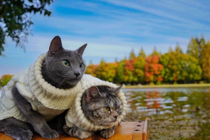 【今週のエレペット】セーターを着て、秋の公園へ繰り出そう(ロシアンブルー・アメリカンショートヘア)