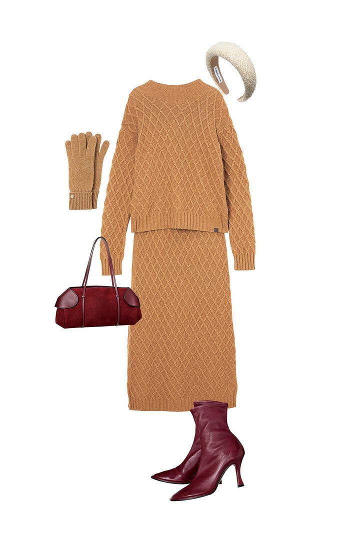 ケーブル編みのニットアップは、ゆったりとしたトップスに対してスカートはタイトなシルエット。上品なキャメルカラーの装いにボルドーのバッグ&シューズを合わせることで、華を添えて。