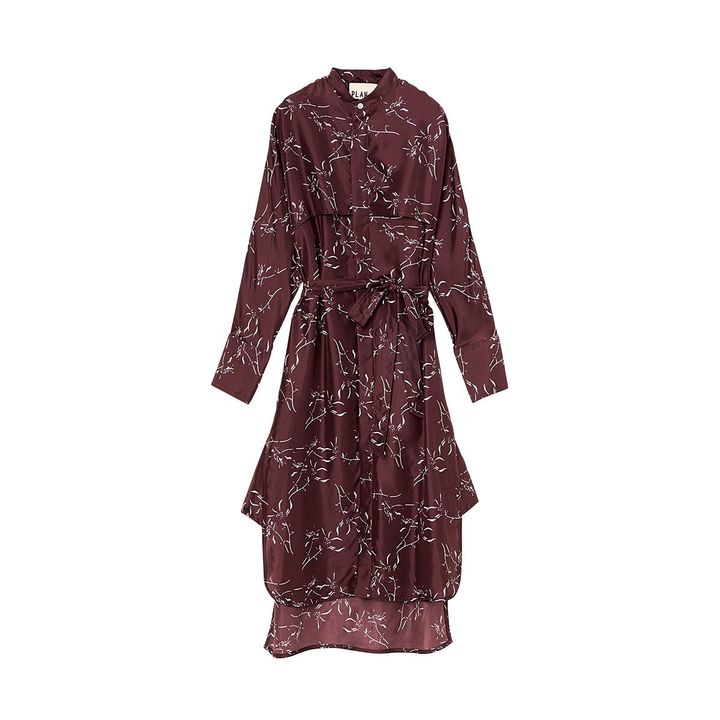 ボルドーの地色にホワイトフラワーを繊細に描いた一枚。ほんのりと透け感のある素材なので、軽やかに着こなせます。ウエストのリボンベルトでメリハリをつけて。
