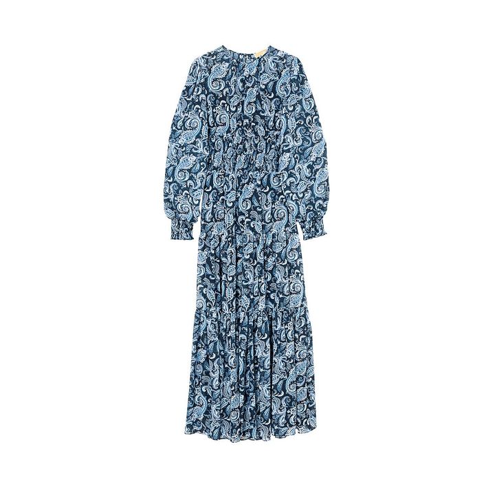 ブルーの濃淡で表現されたペイズリー柄が目を引いて。ボリューミィな袖やウエストのシャーリングに愛らしさを感じるデザインです。