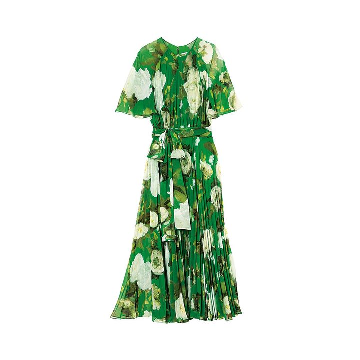 鮮やかなグリーンと真っ白なローズ柄のコントラストが絶妙。フロントやスカート部分にプリーツ加工を施した、ドラマチックなデザインです。
