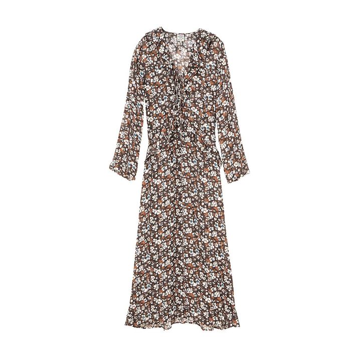 小花を描いたブラウンのワンピースは、フラワーモチーフが浮かび上がる立体感のある織り地が特徴。深めのV字ネックを縦フリルが強調して。