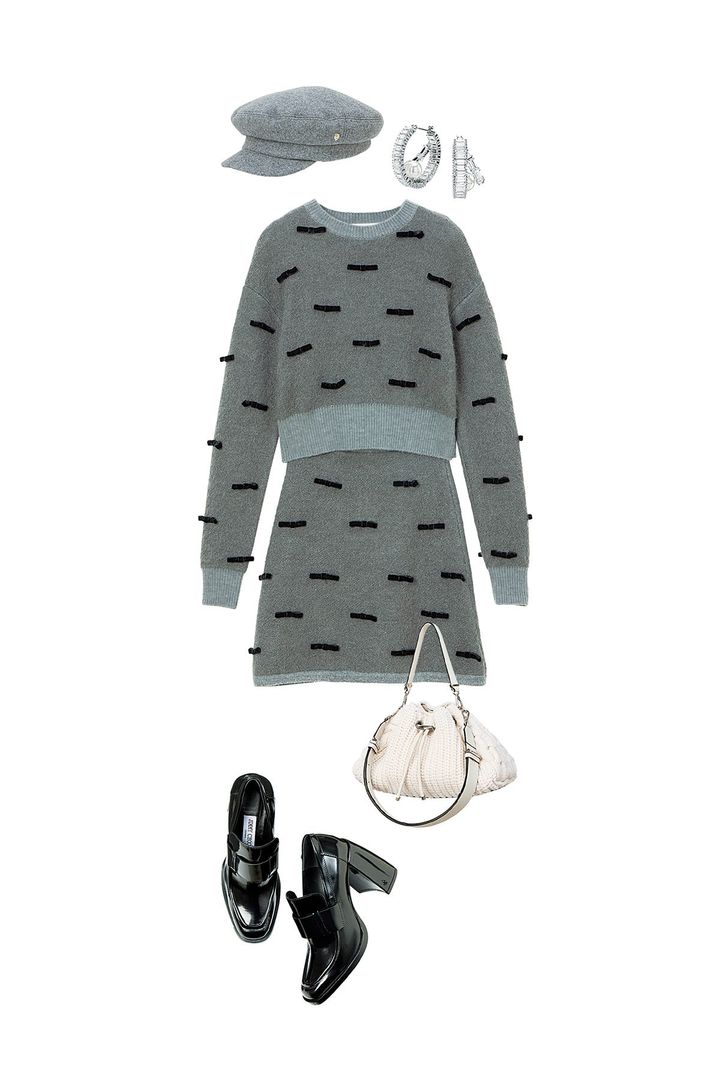 上下ともにミニ丈に仕上げた、トレンド感のあるデザイン。グレーのモヘア素材にベルベットのリボンモチーフをたっぷりとちりばめることで抜群の愛らしさに。クリスタルのピアスで顔まわりに輝きをON。
