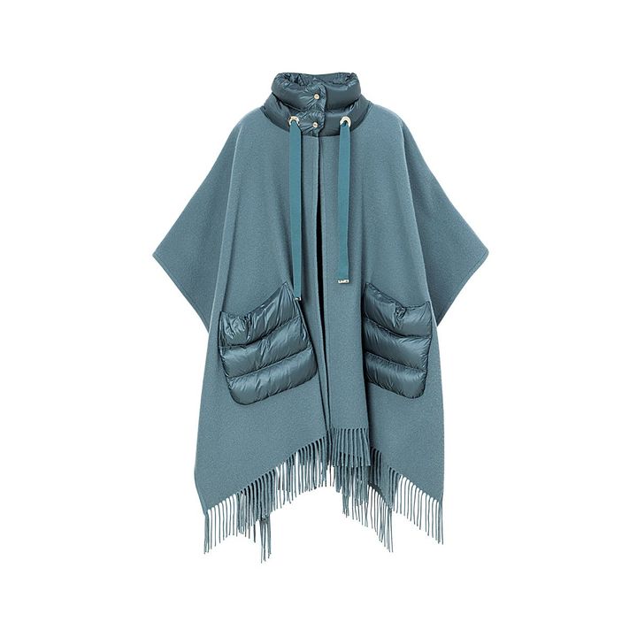 首元とポケットにダウン入りのキルティングをあしらったウールカシミヤのケープ。グログランのドローストリングとフリンジが軽快に揺れる一枚です。