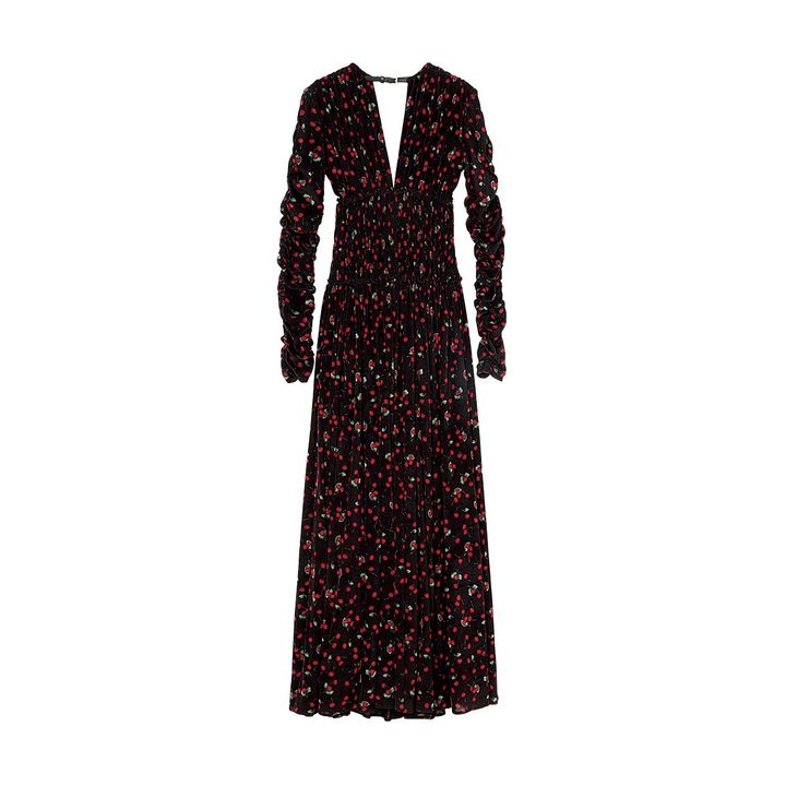 ベルベット素材にキュートなさくらんぼが描かれたマキシ丈ワンピース。ウエスト部分とアームホールに細かなギャザーを施すことで、メリハリのあるシルエットに。