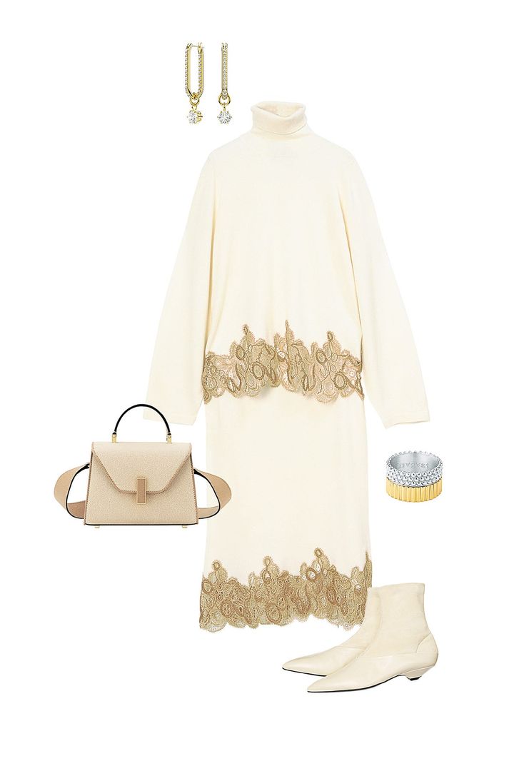カシミヤニットに繊細なレースを配することで、フェミニニティを際立たせて。