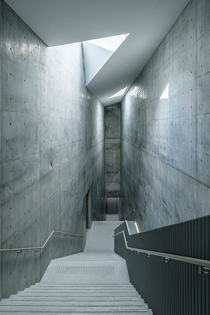 直島新美術館の中心を貫く階段室は、建築家、安藤忠雄さんらしい精緻で美しいコンクリートの空間。天窓からは自然光が降り注ぎ、刻々と表情を変える光の演出がドラマティック。この両側に4つの展示室が配されている。ベネッセアートサイト直島では10番目となる安藤建築。 GION