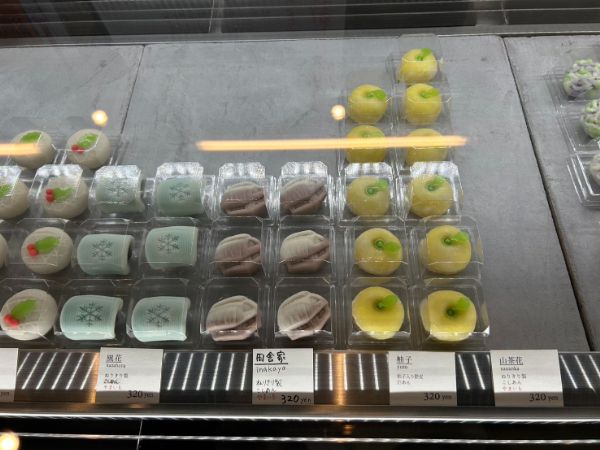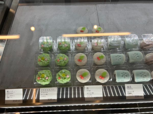 ショーケースに並ぶ上生菓子。色とりどりのお菓子がこんなにもたくさん並びます。 この時期となるとやはりクリスマス、季節感あふれる作品にわくわくが止まりません。