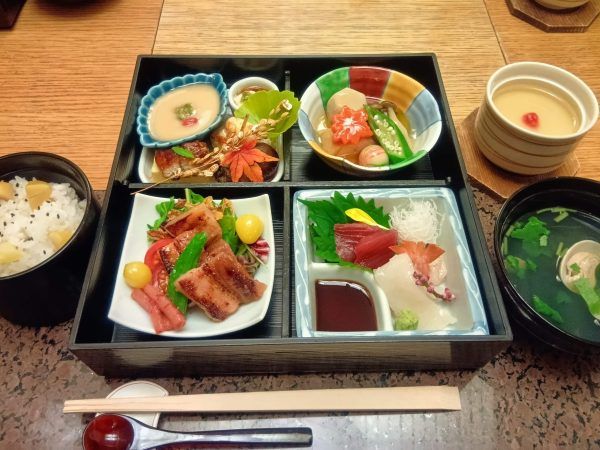 旬菜四品・御飯・小吸椀・茶碗蒸し・デザートまで付いた「椿弁当」です(2750円)。 季節を愛でる絢爛豪華な和食の品々に感動です。一品ずつ丁寧に出してくださるおもてなしにも感動・・