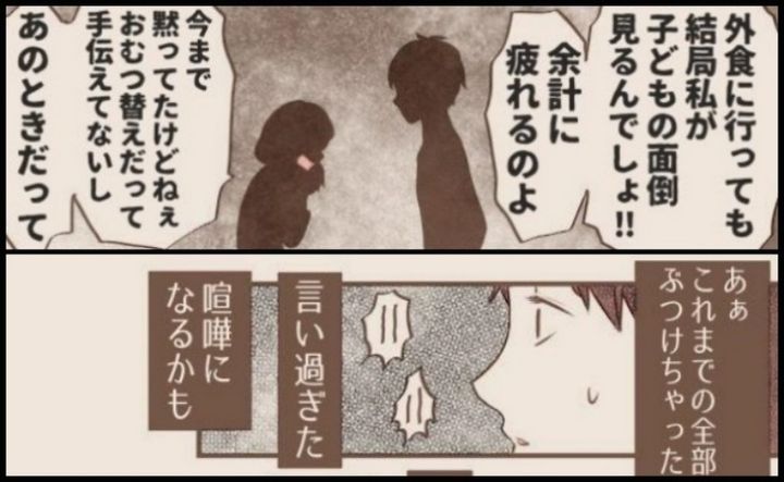 「外食って、結局私が子どもの面倒みるんでしょ! 余計に疲れるの!」とイライラをぶつけてしまい……。そして、おむつ替えのときにまったく手伝えていないことや、普段のうっぷんを全部パパにぶつけてしまったのです。そして言ったあとに、「言い過ぎた」と思いました。