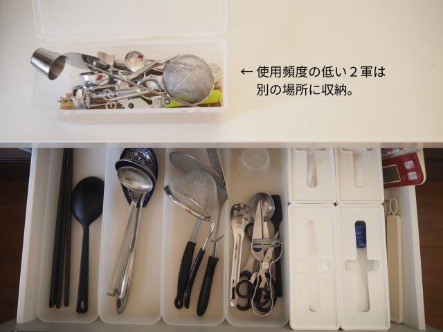 すべてを一緒くたに収納してしまうと、日々の使い勝手が悪くなってしまうので、使用頻度の低いアイテムは場所を変えて収納しておくのも一つの手です。