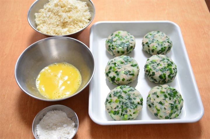 4. 平たい円形にまとめて、小麦粉、卵、パン粉の順で衣をつける。