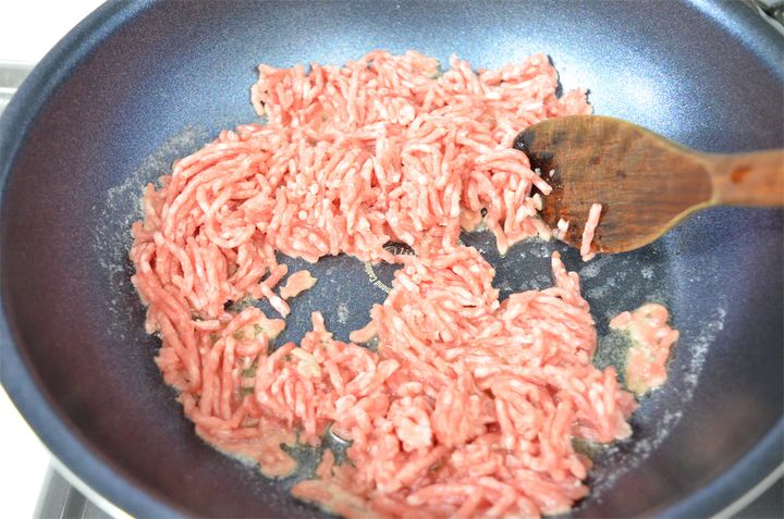 2. ニラは5mm幅に切り、豚ひき肉と一緒にバターを熱したフライパンで炒める。