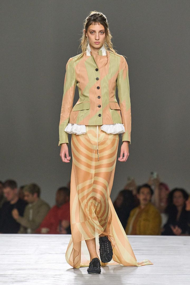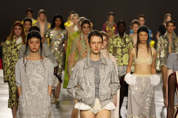 コレクションは、肩の立体感やウエストのシェイプ、広がる裾のコントラストを強調した、多様なシルエットで構成されている。クラシックなコルセットやスケーター風ドレス、サヴィル ロウ・スタイルのテーラードまで、オーバーサイズの抜け感と精巧な構築美が自然に融合する。テクスチャーへのこだわりも際立ち、植物由来のフェイクフェザーやリサイクル・バイオプラスチックのスパンコールが軽やかに揺れ、持続可能性をデザインとして可視化していた。なかでも、空気中の汚染物質を吸収・無害化する新素材“Pure.Tech”で仕立てたデニムは、歩くたびに空気を浄化するという革新的な試みとなっている。