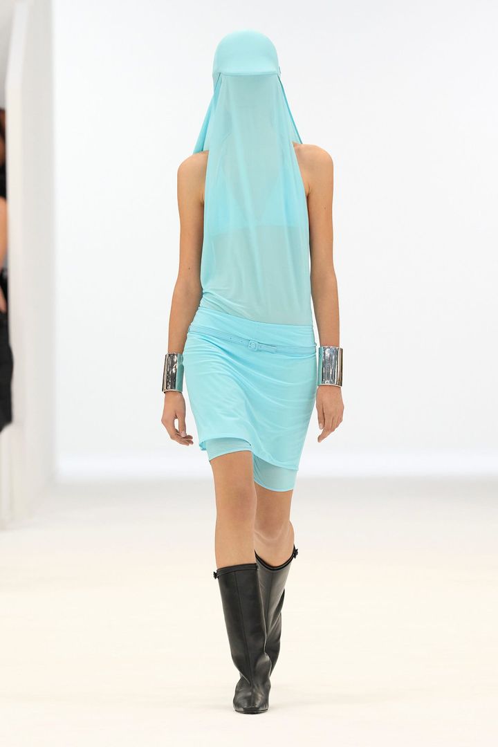 「クレージュ」の招待状は、一組の黒いサングラスだった。箱の底には「私をショーに連れていって」と小さく記されている。タイトルは“Blinded by the Sun(太陽に目をくらまされて)”。アーティスティック ディレクターのニコラス・デ・フェリーチェは、イビサで過ごした夏の記憶をもとに、灼熱(しゃくねつ)の現実と幻想のあわいを描いた。純白の円形ステージに光が満ちるなか、モデルたちは顔を覆うベール付きのキャップをかぶり、ミニスカートとつながった布を風に揺らしながら歩く。覆い、さらけ出し、また覆う——そのリズムがこのコレクションの呼吸だった。