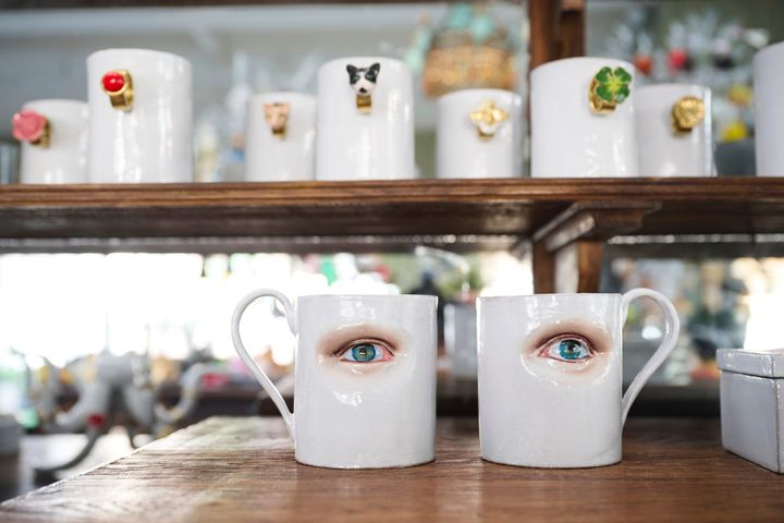 〈写真〉今回のオープンに合わせてセレナと新たに作った新作のマグ。目はセレナにとって自身の作品でもくり返し取り入れてきたモチーフ。