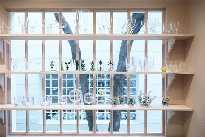 〈写真〉窓辺の棚にはガラスウェアが並び、自然光によってその美しさが際立つ。
