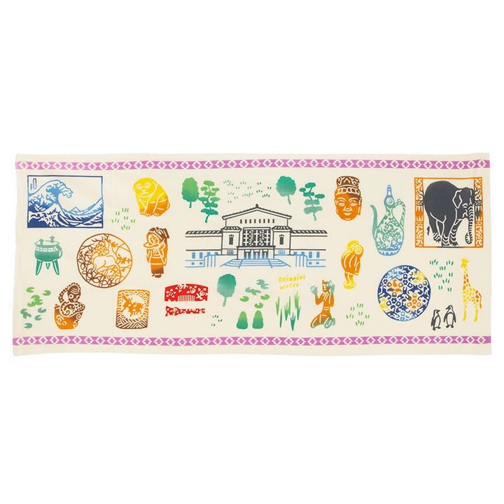 大阪・天王寺公園内に位置し、2025年3月にリニューアルオープンを果たした「大阪市立美術館」。左右対称の翼廊とせり出した正面玄関から成る、荘厳な建築が特徴で登録有形文化財にも指定されている。美術館オリジナルの手ぬぐいは、伝統技法の注染(ちゅうせん)を用いた大阪・堺発祥の手ぬぐいブランド「にじゆら」とコラボレーションしたもの。建築を中心に、その周りを館蔵品や庭園の風景をちりばめたポップなデザインが魅力。